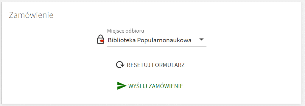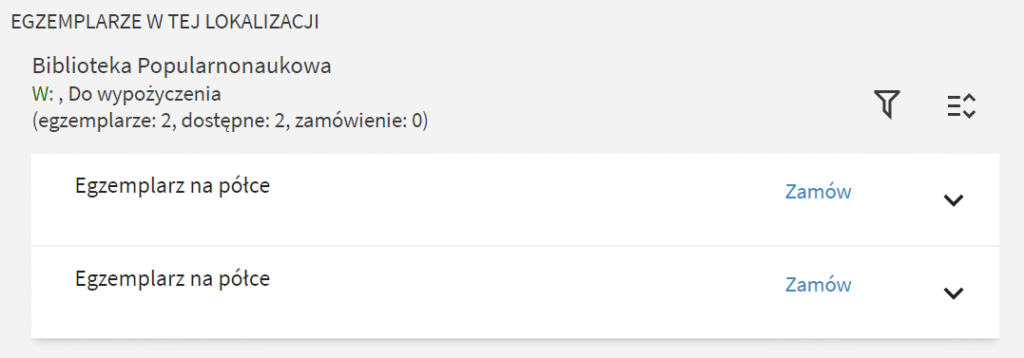– Status egzemplarza informujący o tym, czy książkę można wypożyczać (“na miesiąc”, “na dwa tygodnie”) czy można z niej skorzystać na miejscu (“na miejscu”). Czasopisma bieżące mają status “księgozbiór podręczny”, co oznacza, że nie można ich zamawiać ani wypożyczać, ale można przyjść i skorzystać z nich na miejscu.